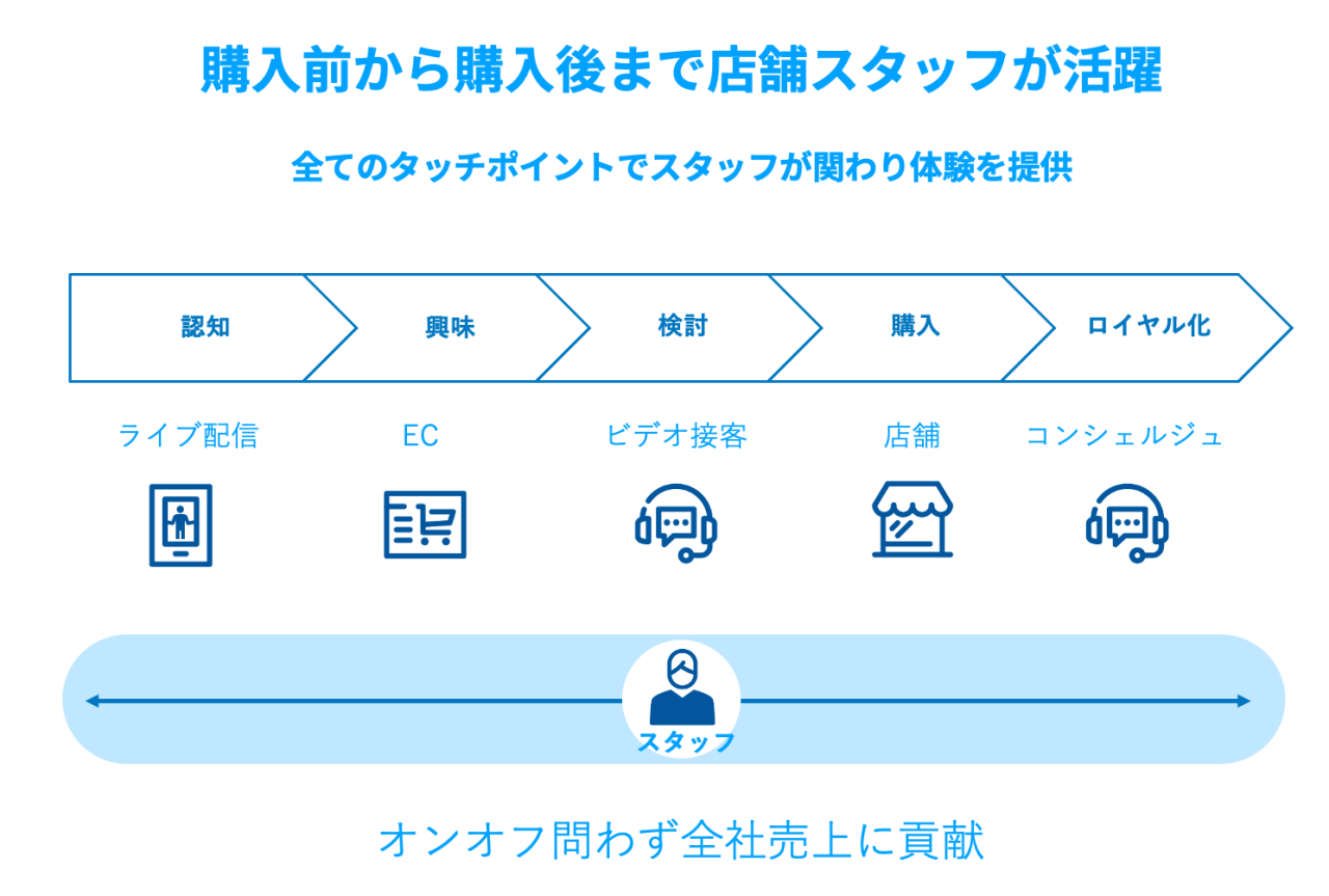 これまで、実店舗スタッフは最終的な購入決定の場面にしか関わることができませんでした。しかし、デジタルという武器を手にすることにより、購入プロセスの始めから終わりまですべてのタッチポイントで店舗スタッフが関わることができるようになり、オンライン・オフライン両方でスタッフのスキルを有効活用できます。