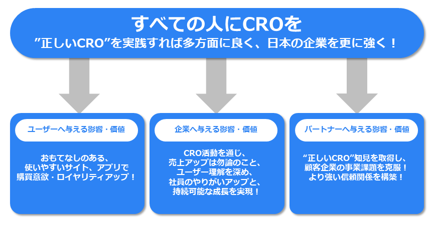 「正しいCRO」を日本のマーケットへ広く伝えていくことで、ユーザー・企業・パートナーの多方面へ、多大な価値を提供していきたいと、CROグループは考えています。