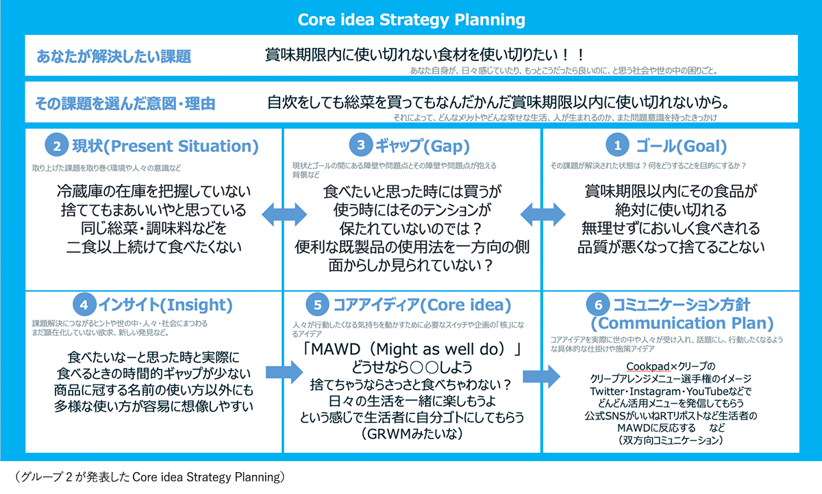 ● 新型コロナウイルスの影響で起こった社会課題や身の回りの小さな課題などを解決したいと思った。今回使った「Core idea Strategy Planning」のフレームワークに当てはめると現状を把握したり、整理しやすくなると感じた。