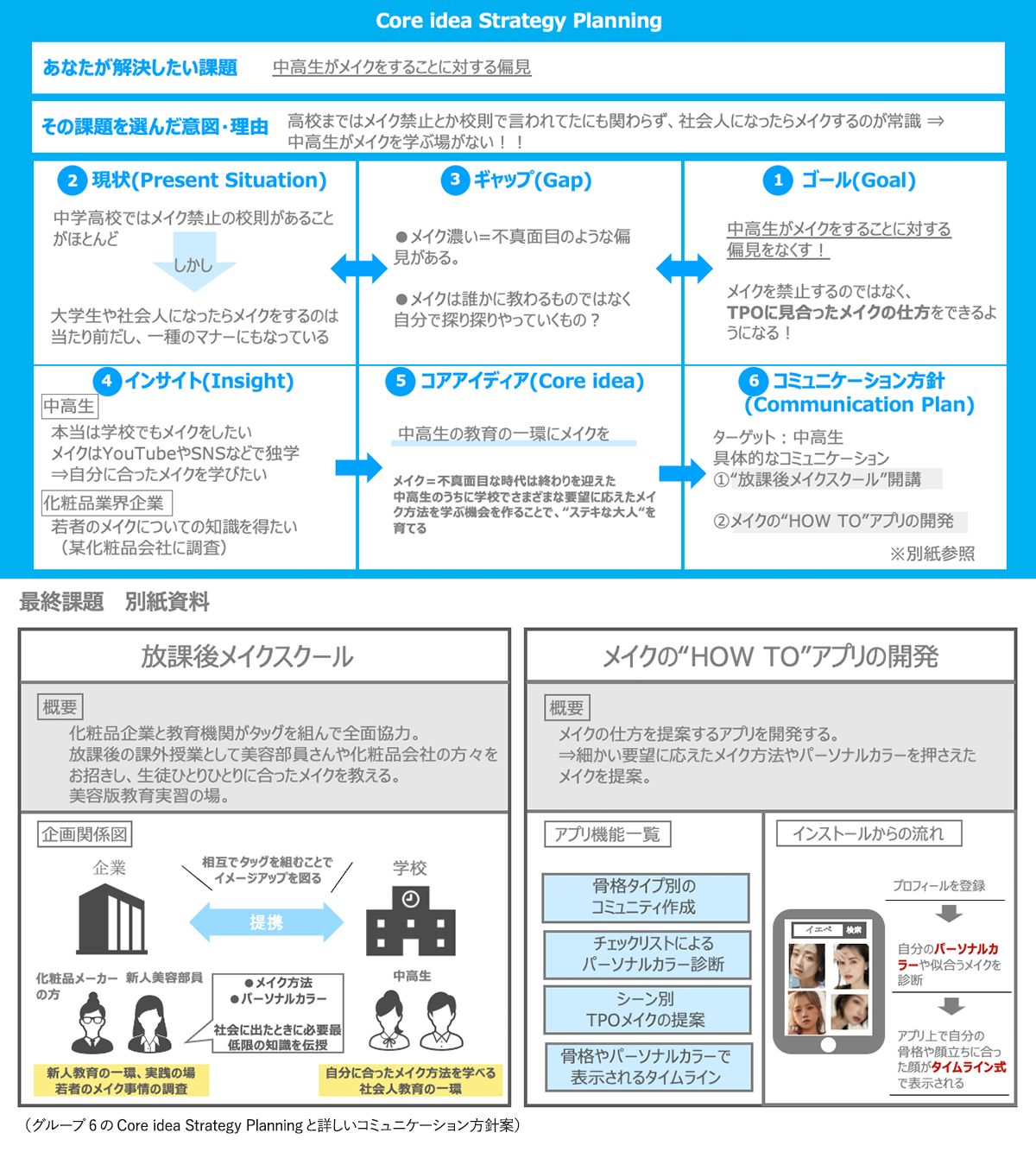 続いてのプレゼンテーションはグループ6。メンバーのひとりの、「高校まではメーク禁止と校則で言われていたにも関わらず、社会人になったらメークするのが常識、と言われるのは納得できない。それなら中高生の時にTPOに合わせたメークを学ぶ場を作ってほしい!」という発言がきっかけでテーマが決まったと言います。