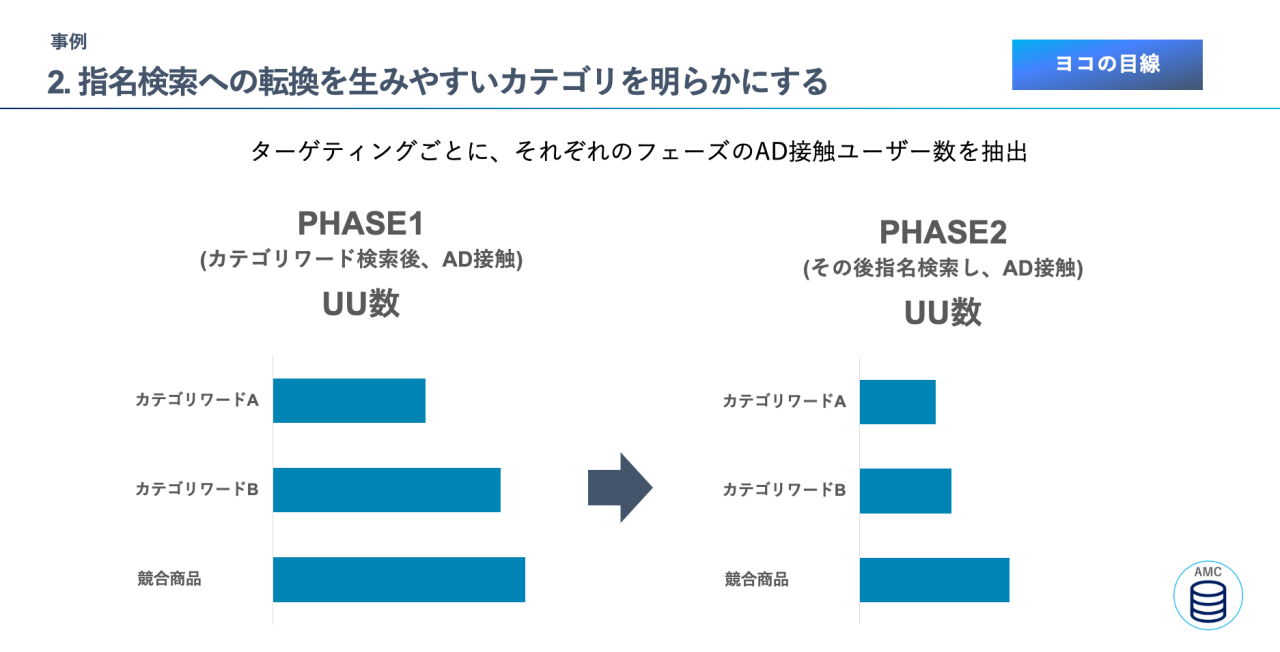 AMCでの分析①広告に接触したUU数:分析にあたり、まずは時系列を2つのフェーズに分けます。フェーズ1は、カテゴリワードを検索して広告に接触し、ユーザーが訴求商品を認知した段階。フェーズ2は、商品認知をトリガーとして購買意向が促された結果、指名検索を行う段階。下図が各フェーズにおけるユーザーの接触状況で、グラフは各ターゲティングの広告に接触したユーザー数を、ユニークユーザー(UU)ベースで示しています。各フェーズとも、競合商品、カテゴリワードB、カテゴリワードAの順に、広告に接触したユーザーが多いことがわかりました。
