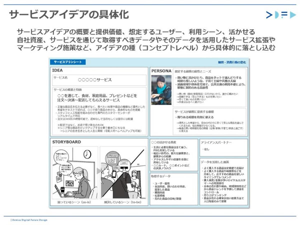 サービスデザインシートは、サービスアイデアの概要と提供価値、想定するユーザー、利用シーン、活かせる自社資産、サービスを通じて取得すべきデータやそのデータを活用したサービス拡張イメージなどの項目で構成されています。