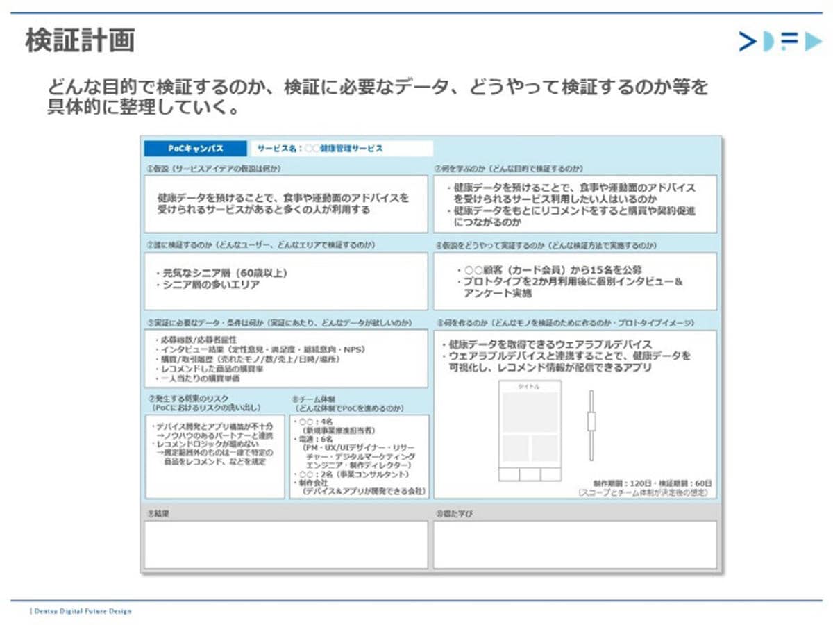さらにもう1枚、⑤の段階(検証実施)の前にも、「PoCキャンバス」というシートを作成します。どんな目的で検証するのか、検証に必要なデータはなにか、どのように検証するのかなどを具体的に言語化し、必要な手順をまとめることで、実際にPoC(Proof of Concept:概念実証)を実施する際に必要な情報を整理します。
