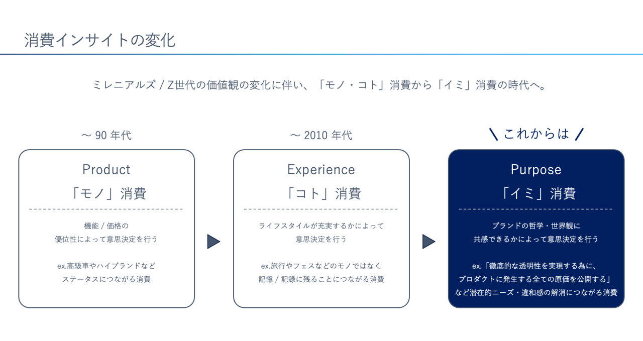昨今の消費シーンを牽引するミレニアルズ(1980年代〜1990年代前半生まれ)、Z世代(1990年代後半〜2000年代生まれ)の消費インサイトの変化に伴い、高度経済成長期に始まった「モノ消費時代」から2000年代初頭の「コト消費時代」を経て、現代は「イミ消費時代」である、と言われています。