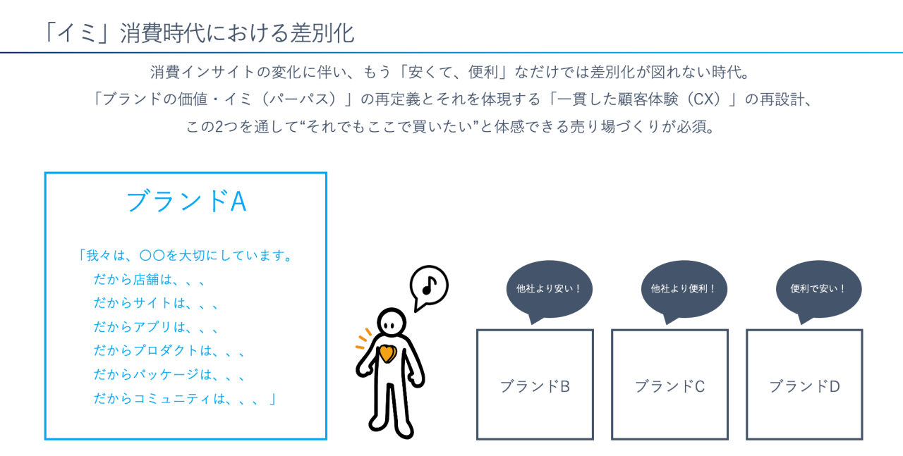 「イミ消費時代において、単に安くて便利なことは他社との差別化にならない」と高橋は指摘します。「自社ブランドが生活者にとって必要とされる価値や意味、存在意義(パーパス)を再定義し、それを体現するために一貫した顧客体験を再設計すべきだ。これらを通じて、消費者に『それでもここで買いたい』と思ってもらわなくてはならない」。