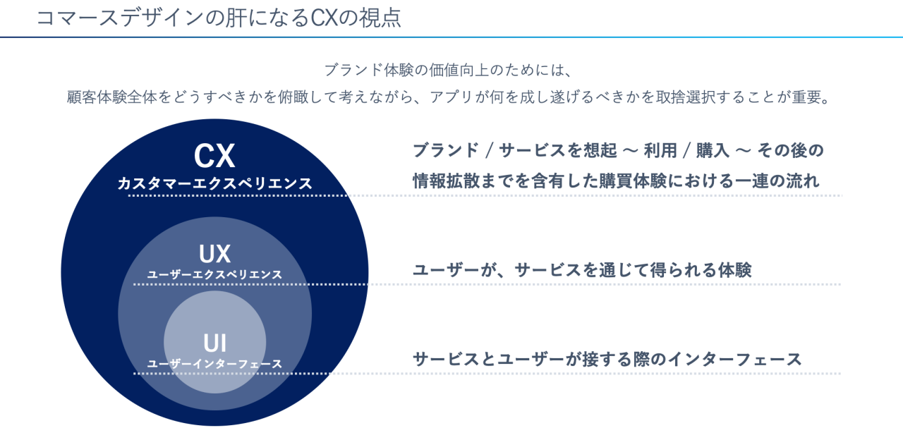 コマースデザインの要となるのが、CX(顧客体験)の視点です。自社アプリでのCXを設計するにあたっては、アプリ単体の体験ではなく、ブランドの顧客体験全体を見渡す俯瞰的な観点から臨みましょう。ブランド全体を通じた顧客体験の中で、アプリが何を成し遂げられるかを考えることで、ブランド体験の価値を高めることができます。
