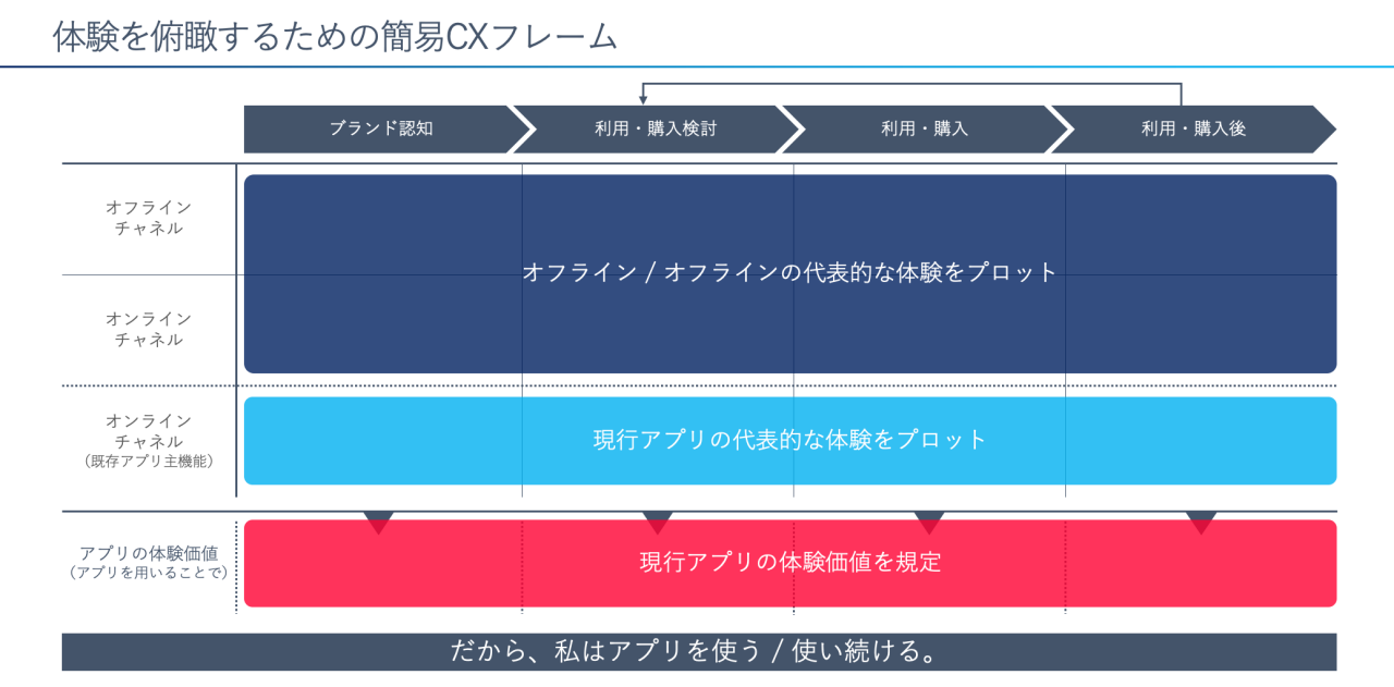 ここで、体験を俯瞰するための簡易CXフレーム(下図)を見ていきましょう。横軸にブランドとユーザーの接触フロー、縦軸にチャネルをとり、それぞれのフローでユーザーにどんな体験を提供しているかを書き出します。すると、アプリがどんな価値でユーザーに使われているかを俯瞰で確認することができます。