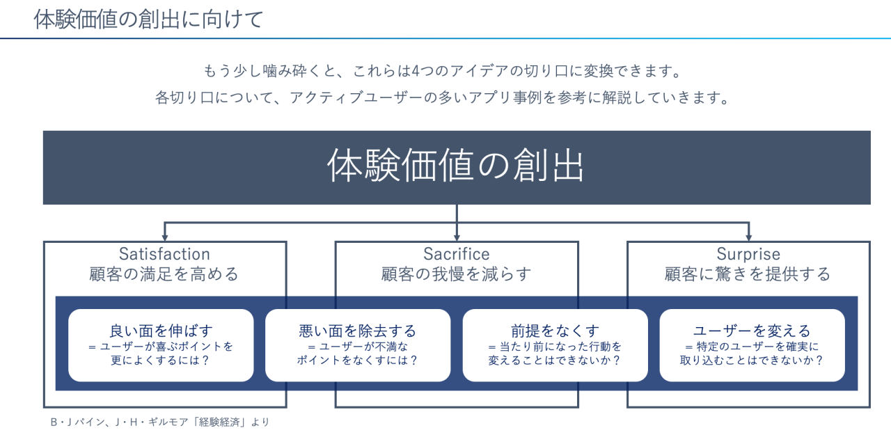 現状を確認したら、新しい体験価値の創出を考えていきます。新しい体験価値の創出には「顧客の満足を高める」「顧客の我慢を減らす」「顧客に驚きを提供する」という3つの要素が必要とされています。高橋はこれを「良い面を伸ばす」「悪い面を除去する」「前提をなくす」「ユーザーを変える」という4つのアイデアの切り口に変換します。