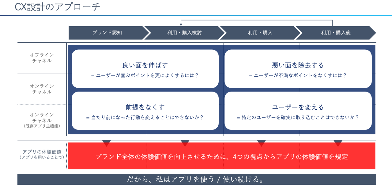 このように、現在の体験フローをCXフレームに当てはめて俯瞰し、4つの切り口からブランドの魅力を高めるアプリの体験価値を規定または創出することで、ブランド全体の価値体験を向上させていくことがCX設計のアプローチと言えます。最終的には、アプリを使う人自身が「このアプリは自分にとって〇〇、だから使う」という理由や意義を創出することが、CX設計のゴールです。