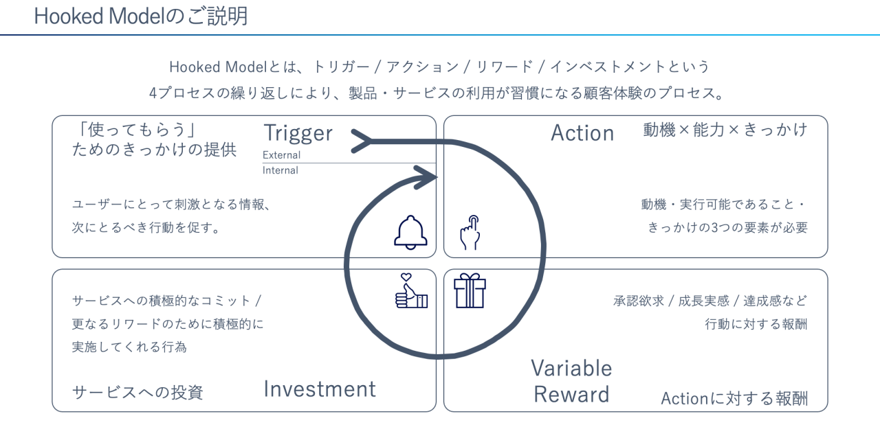 Hooked Model(下図)では、顧客体験を「トリガー(きっかけ)」「アクション(行動)」「リワード(報酬)」「インベストメント(投資)」という4つのプロセスに振り分けます。4つのプロセスを繰り返すことで、製品やサービスの利用が習慣化していくという顧客体験を一般化したフレームワークです。