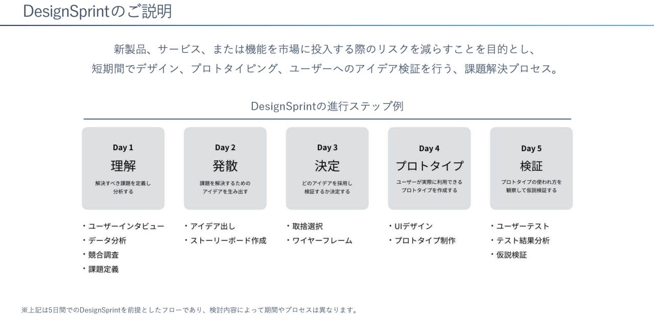 「ただ、Hooked Modelが実際にうまく機能するかどうかは机上の空論になりがちだ」とも高橋は述べています。この問題を解決するためには、「Design Sprint」という手法で短期集中、かつ、ユーザー対話型の手法も有効だ、と続けました。Design Sprintとは、短期間でデザイン・プロトタイピング・ユーザーへのアイデア検証を行うための課題解決プロセスです。