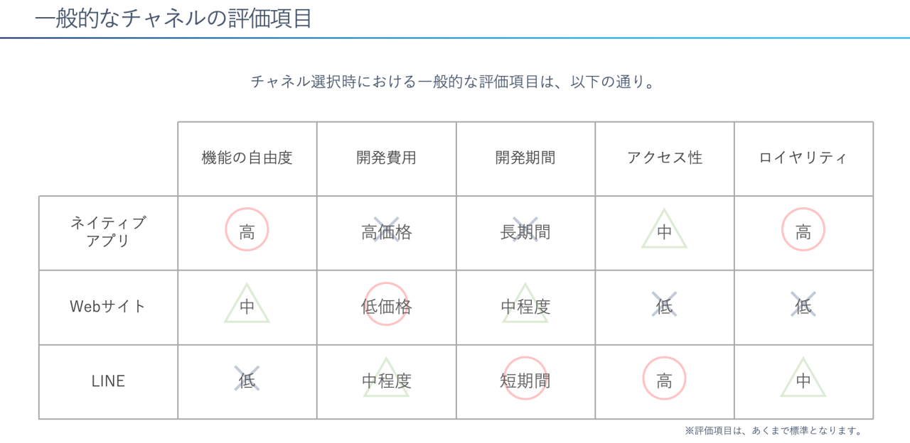 チャネル選択時に評価される一般的な項目(下の表)を考えると、各チャネルは以下のような特徴を持っています。