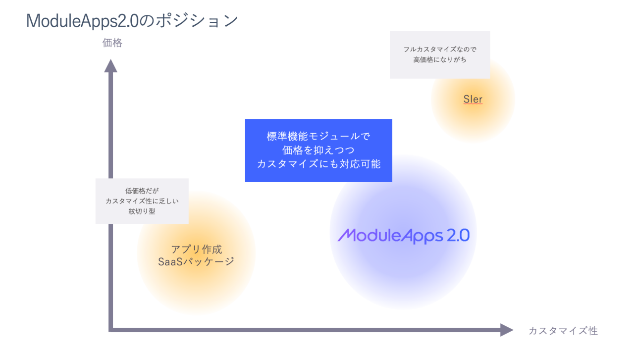 さらに、モジュールだけでなく後からカスタマイズすれば、アプリに機能をどんどん上乗せしていくこともできます。このように、「初期段階」「顧客の需要が高まってきた段階」「効率よく良いサイクルを回す段階」といったフェーズごとの対応が可能なのも大きなメリットです。