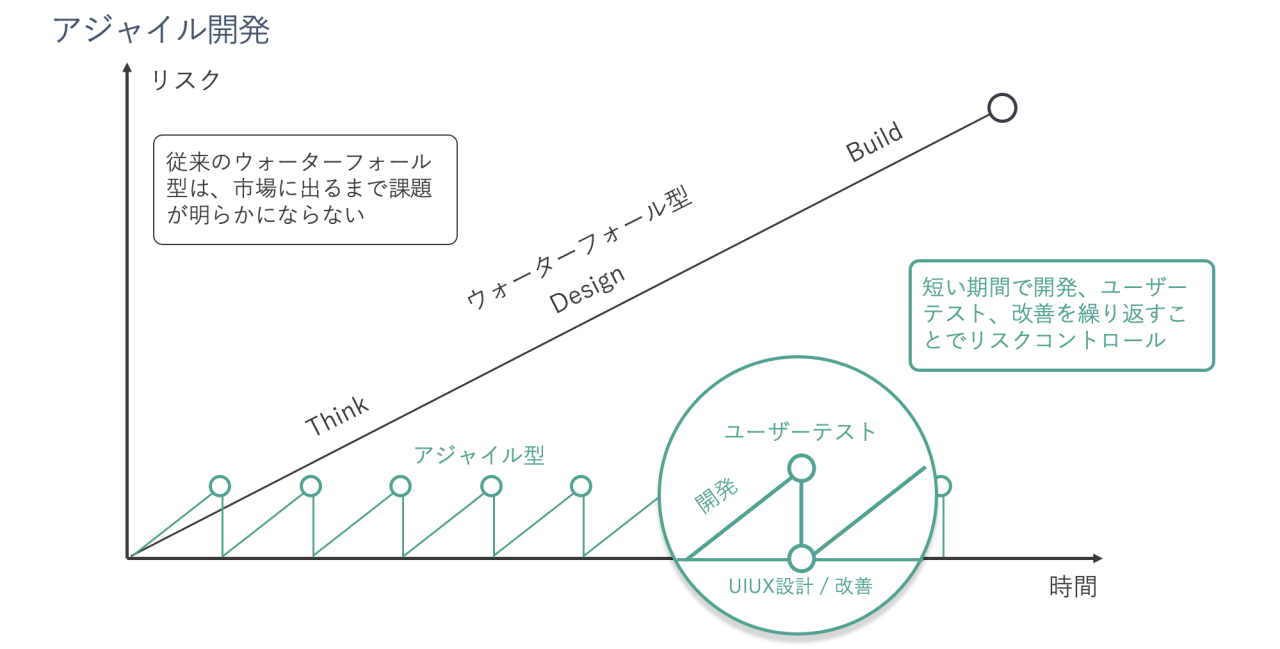 これまで、アプリ設計にはいわゆるウォーターフォール型の手法が採られてきました。この手法だと、実際の企画から世の中に出してユーザーの反応を得て改善を行うには、数ヶ月単位の歳月がかかってしまうでしょう。Design Sprintを使えば、このプロセスを数日で済ませることができます。本当にうまく機能しているかどうか、ユーザーの反応を見ながら確認することも可能です。