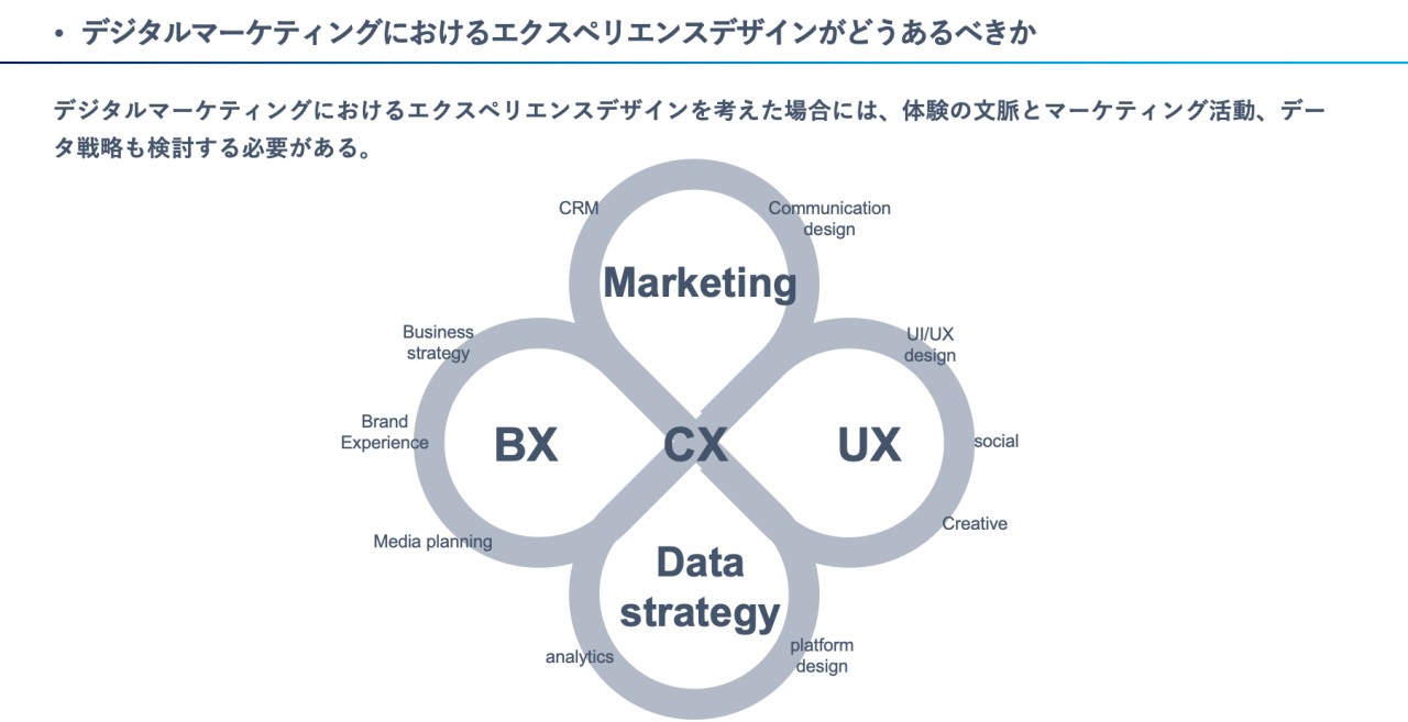 デジタルマーケティングにおけるエクスペリエンスを考えるときには、マーケティングやデータ戦略も忘れてはなりません。体験設計に注力するあまり、マーケティング・データ戦略がおざなりになってしまうことにしばしば出くわすことがありますが、体験の文脈とあわせて検討していく必要があります。