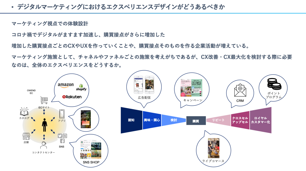 マーケティング視点での体験設計のポイントとして、コロナ禍でのデジタル普及がますます加速し、購買接点がさらに増加したことが挙げられるでしょう。増加した購買接点ごとのCX/UXを作っていくことや購買接点そのものを作る企業活動が増えていると思います。