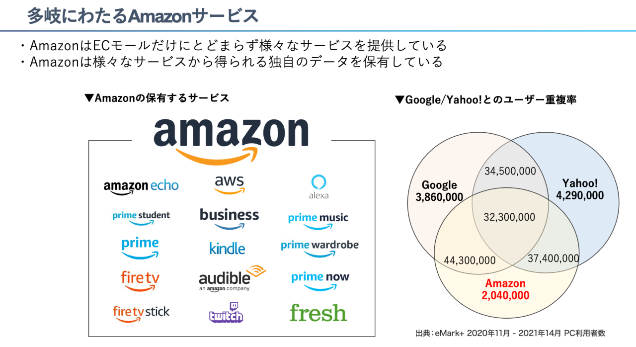 - ECにとどまらず、Amazonにはさまざまなサービスがあり、そこから得られる独自のデータを保有している。また、次図の“Google/Yahoo!とのユーザー重複率”でもわかるように、Amazonでしかリーチできないユーザーがたくさん存在している。Amazonを単純なECモールと捉えず、独自のチャネルとしてフル活用することが望ましい。