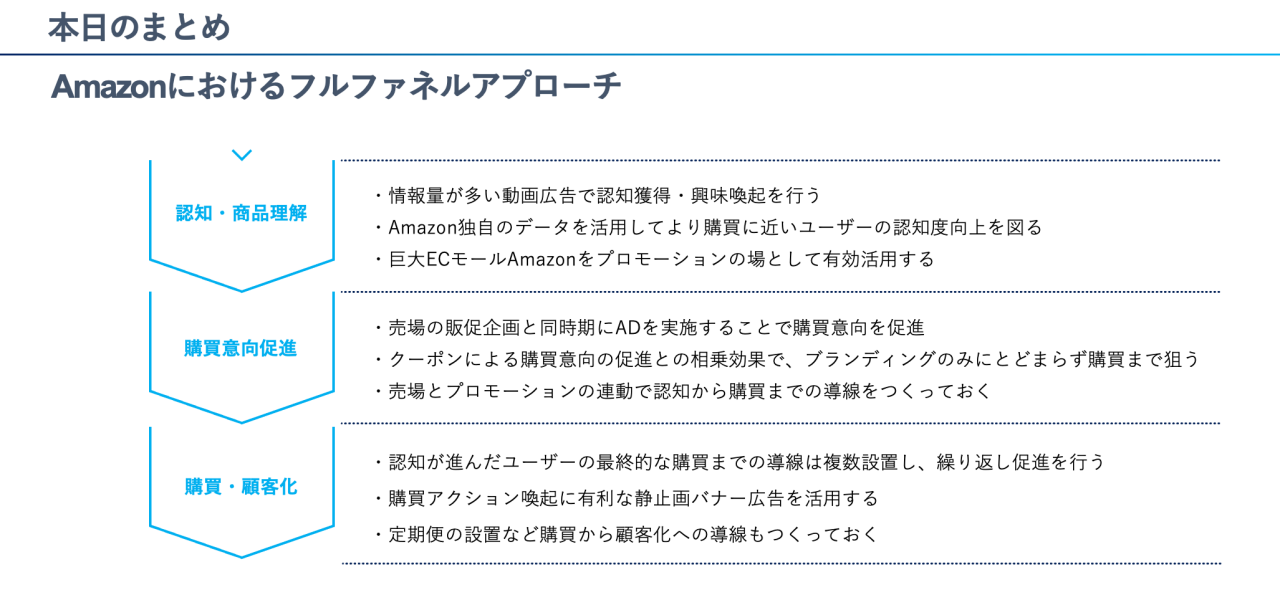 岸本は、「Amazonにおけるフルファネルアプローチ」のまとめとして次図を示し、認知から購買までの一貫した導線を引いておくことがポイントだと強調しました。