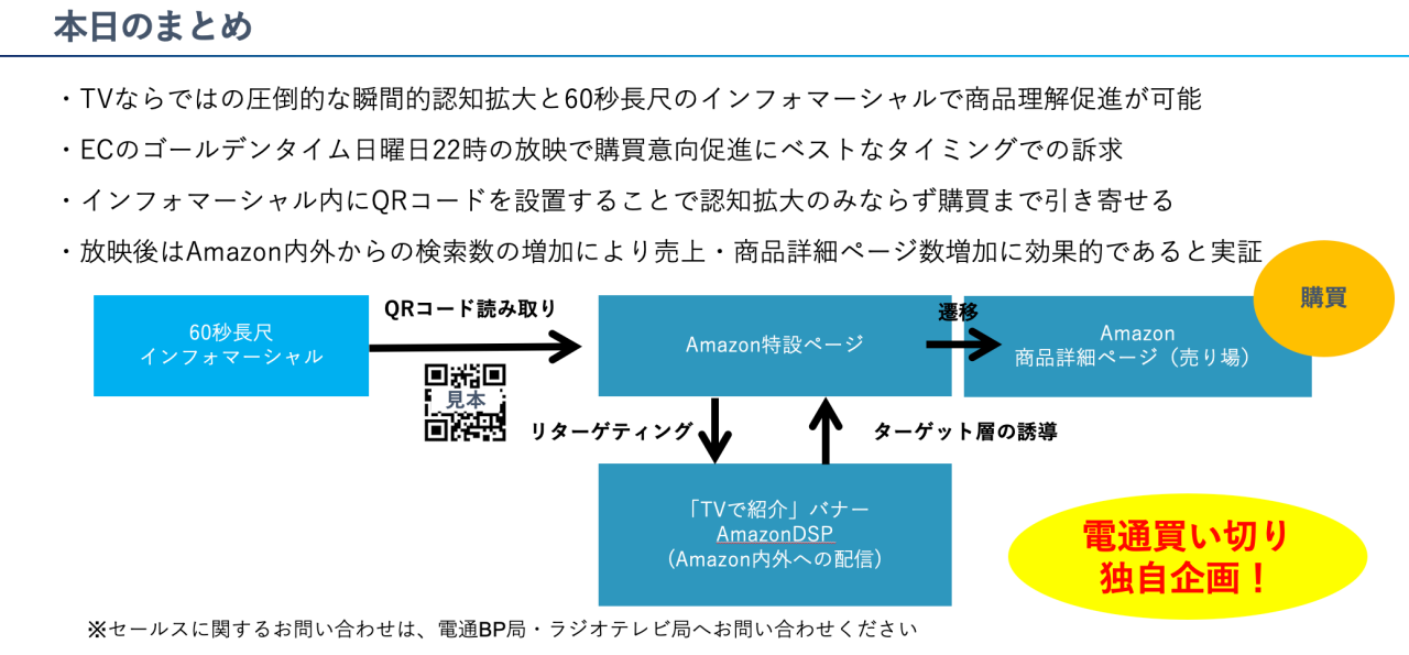 瀬尾は、TV×Amazon連動企画での施策事例のまとめとして、次図を紹介。インフォマーシャル内のQRコードからAmazonに遷移させ、認知から購買まで一気通貫した導線を引き、さらに、Amazon DSPを活用して放映時のみならず放映後のユーザーの刈り取りも促進する仕組みをつくった重要性を語りました。