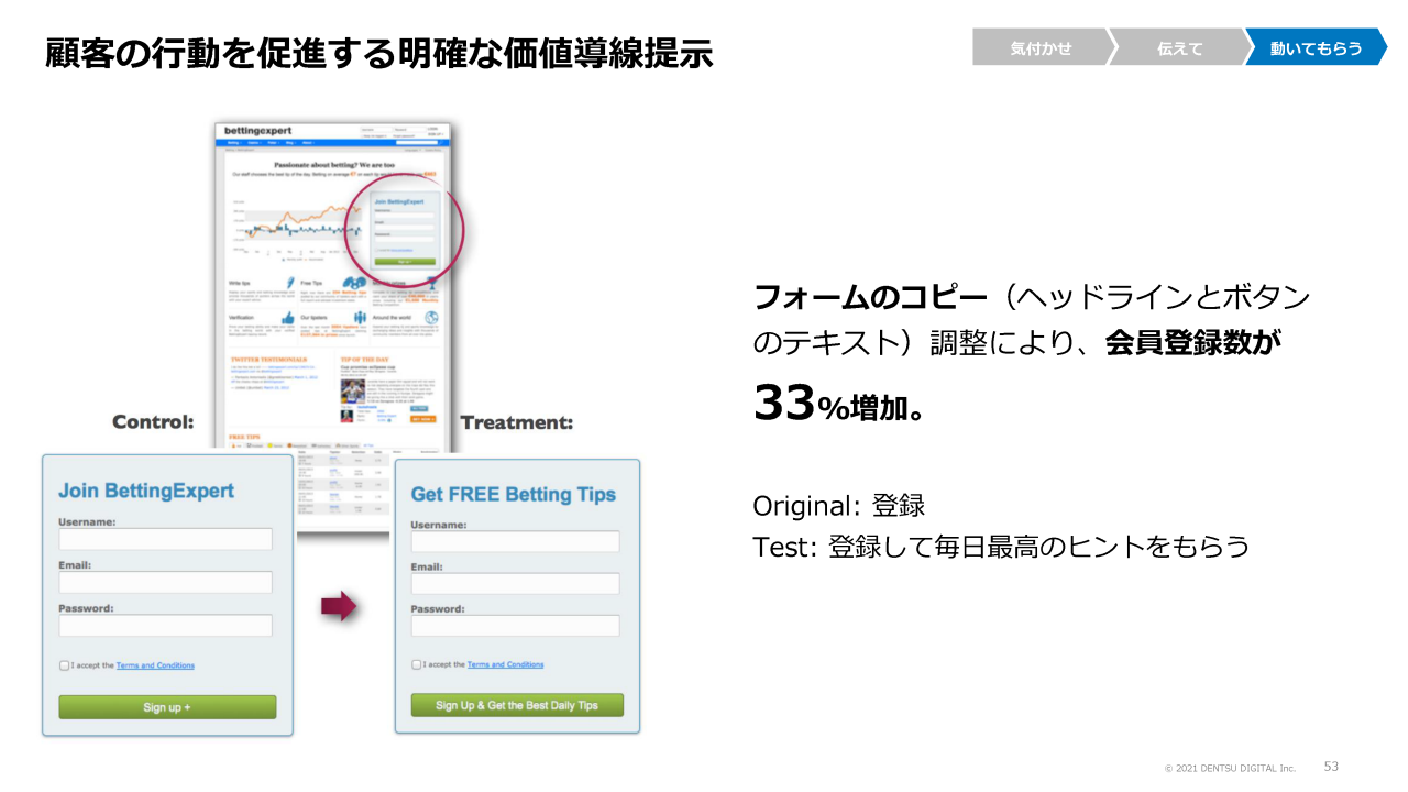 ボタンのラベルを単に「登録」とした場合と、メリットを明示する「登録して毎日最高のヒントをもらう」とした場合で比較したところ、後者のほうが会員登録数は33%も増加しました。このようなマイクロコピーの調整は手をつけやすく、場合によっては大きな効果を得ることができます。