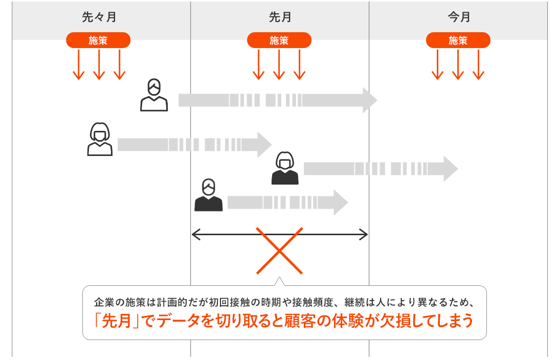 ところが、マーケティングや接客の結果として「訪問者や顧客はどう変わったのか」を理解するには、一律の期間設定は不適切です。顧客は一人ひとり異なる人間であり、企業と接する体験が始まるタイミングも、その後の継続性も、企業が望むように応じてくれるかも、企業はコントロールできず、人それぞれです。期間を固定してデータを取得すると、体験の一部が欠損した部分的なデータになってしまいます。
