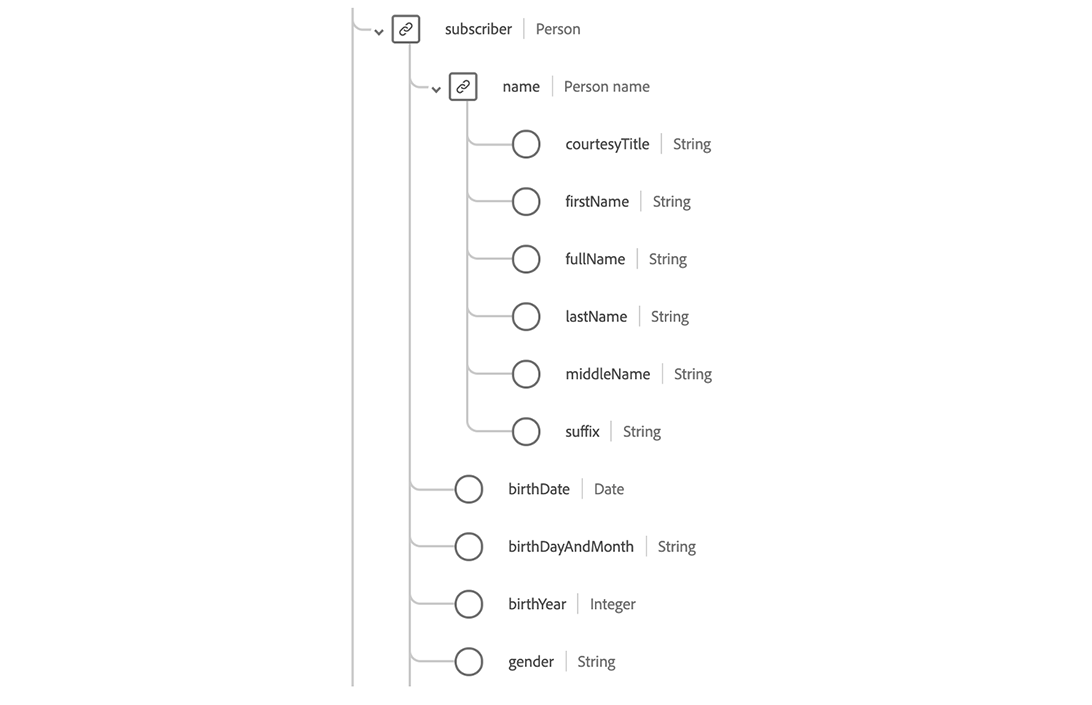誰(subscriber)が、どの端末(device)を使って、どのネットワーク環境(environment)で、何(カテゴリ・商品番号)を、どのように(定期の間隔・課金開始日・決済手段など)購読開始するのか、を構造的に記述できます。このうち、購入者(subscriber)は「Person」(人)という汎用的な構造を継承しているので、名前(姓・名・敬称などに分解される)や誕生日、性別など、人に紐づく属性で構成されます。