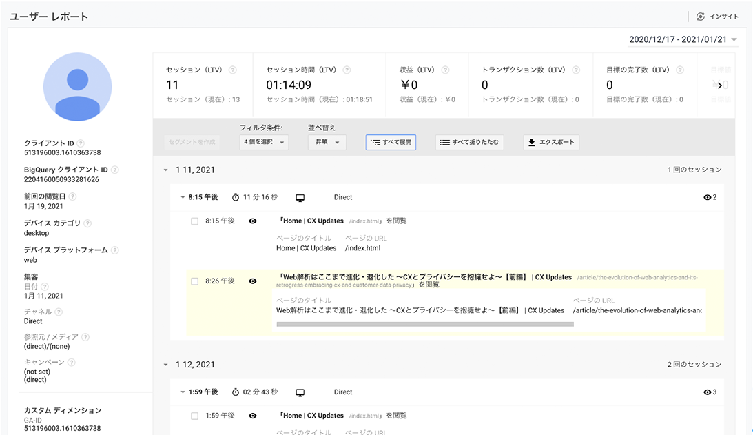 これは、一人ひとりの行動の履歴を追うためのレポートです。前述の理由で、レポートの期間を左パネルの「集客 日付」に書かれた初回訪問日を含めた期間に設定し、「昇順」で並び替えて、最初の訪問からの全ての行動履歴を追うと良いでしょう。