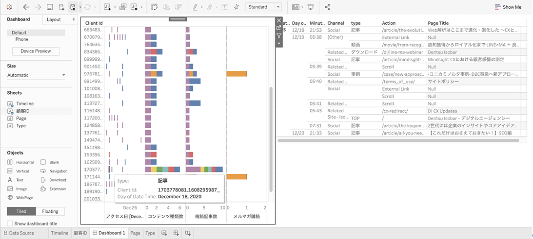 右側の行動ログも、URLからパラメータや「index.html」を除去する、「ページタイトル|電通デジタル」のようなタイトルからサイト共通の部分を除去する、ページのタイプを分類する、アナリティクスでは設定していないコンバージョンを後付けで設定するなど、目視で分析しやすくする調整が可能です。