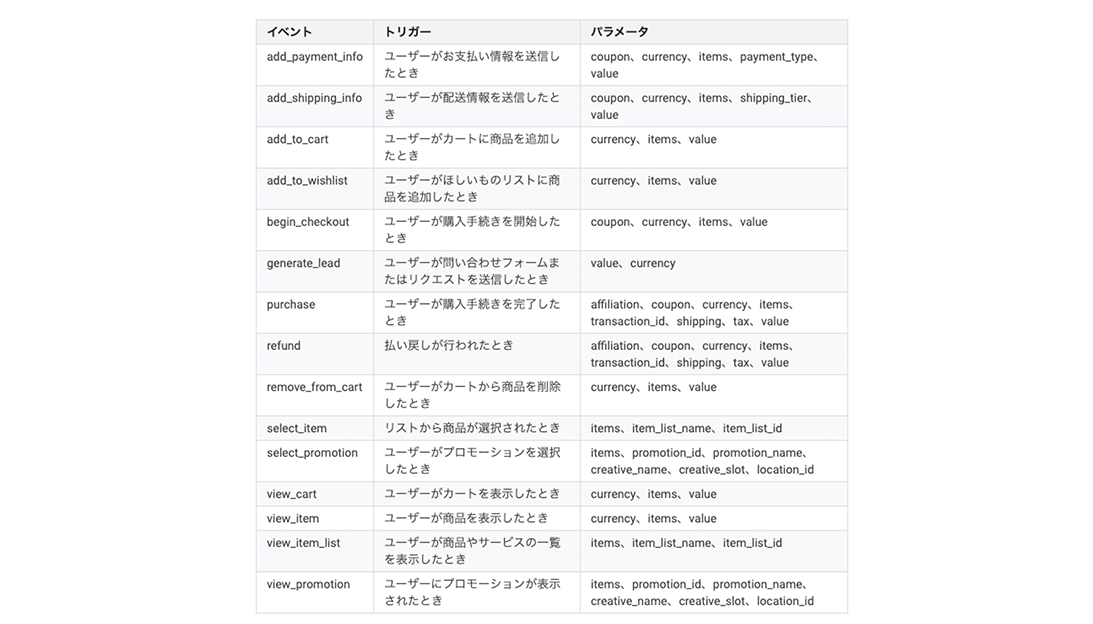 業種に関わらず共通の推奨イベント https://support.google.com/analytics/answer/9267735別ウィンドウで開く
