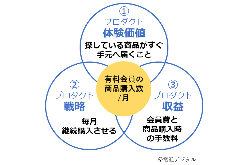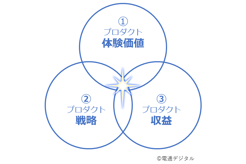 「体験価値」を設定したら、次は前回の記事で紹介したように、3要素が重なる部分を見ながら、North Star Metricを決めていくことになる。今回の3要素は以下のとおりだ。