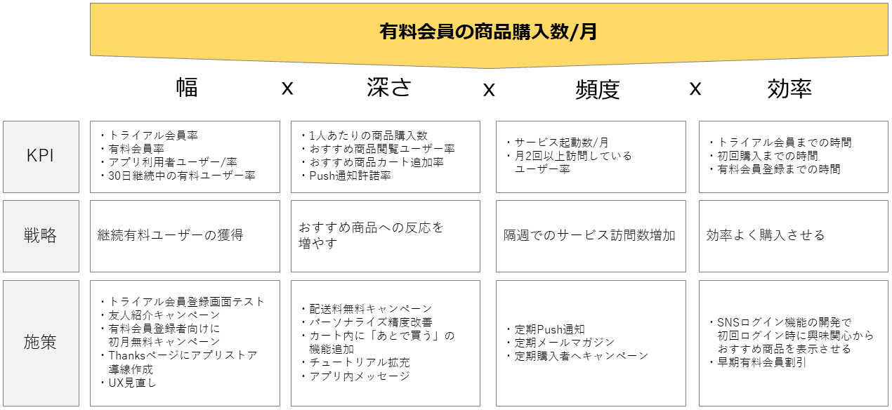 これら方程式を埋めるポイントは、[幅]→[深さ]→[頻度]→[効率]の順にユーザーが行動していくことをイメージすることだ。