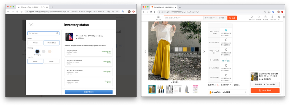 もう少し透明性の高いアプローチでは、顧客が店ごとに在庫確認できるようにします。多くの場合、在庫情報は購買のボタンと共に出されます。