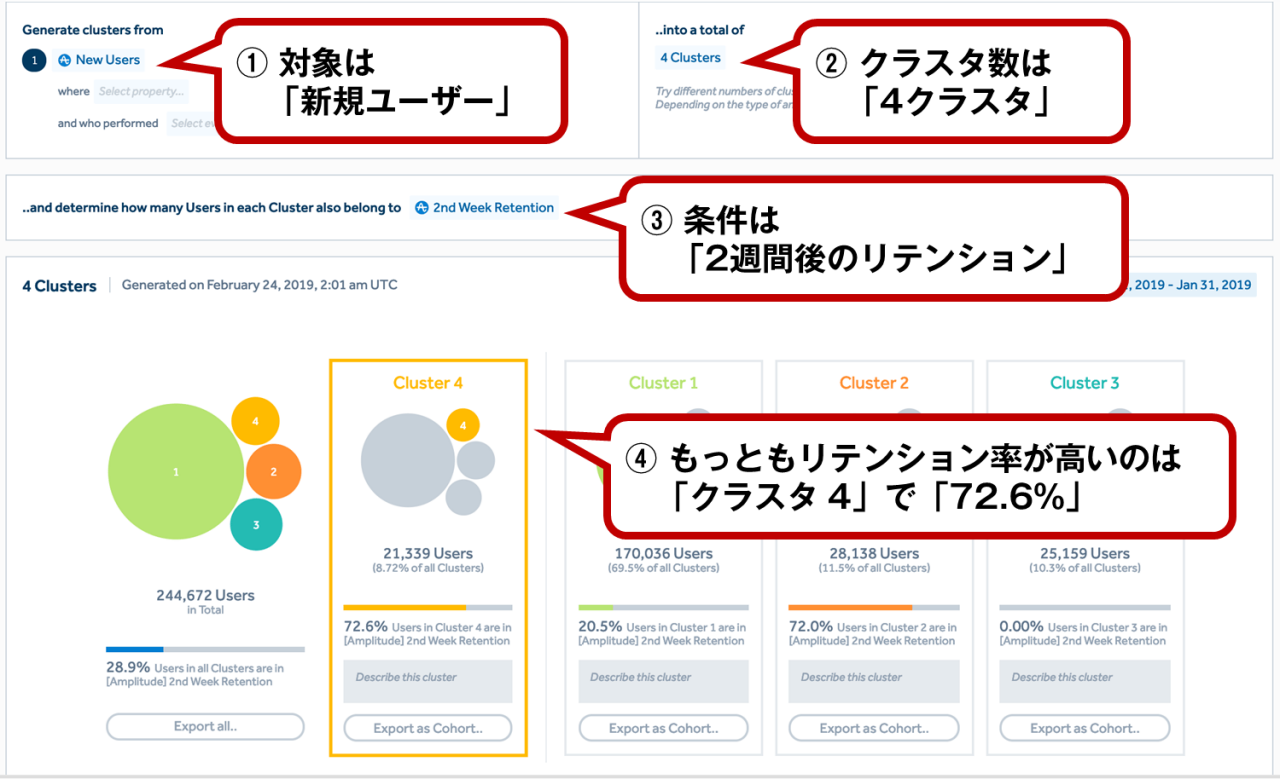 【Personas】はNMF(非負値行列因子分解)を用いてペルソナのクラスタリング分析を行う機能です。クラスタ対象ユーザーと、クラスタ数、クラスタ条件を設定するだけで、ペルソナのパターンが自動生成され、同時にもっともリテンション率の高いクラスタが数秒で判明します。