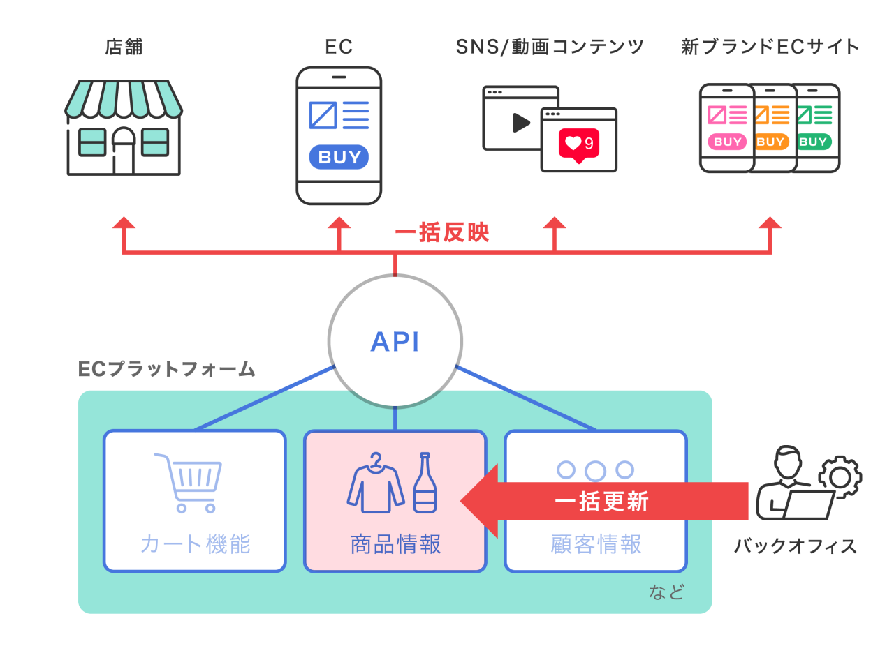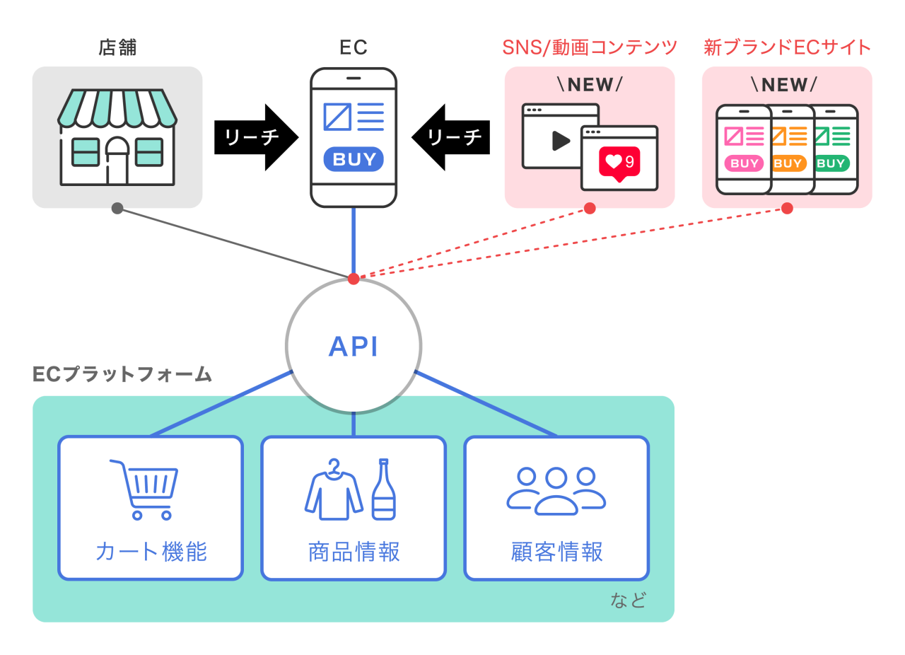 また、それぞれのAPIを介することで、複数ECサイトのデータもバックエンドで一元管理できます。例えば、売上が伸びている店舗のサイトや、新ブランドのポップアップストアを一時的に公開しつつ、在庫管理や商品管理を共通化するといった柔軟なマーケティング戦略も実現可能です。