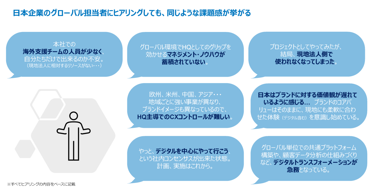 これを見ると、本社と事業部との関係性、現地法人との関係性、現地法人の中にも事業規模や体制の違いがあることなどが、課題として挙がっています。また、日本本社と現地でブランドイメージが異なるとき、どのようにメッセージの統一性を出すのか。CXを統一したいが、現地の体制やスキルセットを考えると、どう進めていいか分からないといった課題があります。