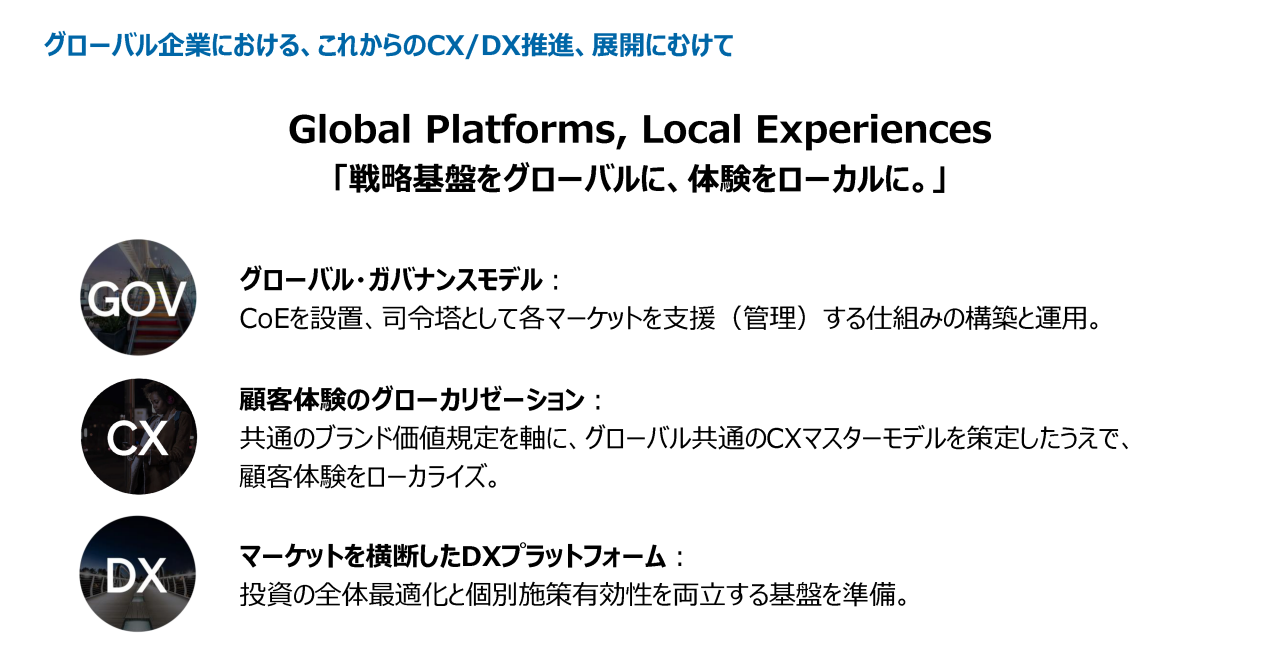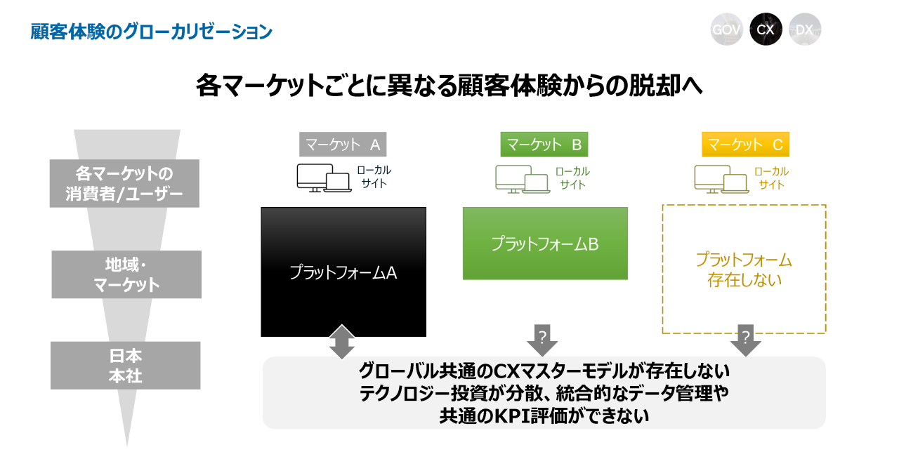 グローバルにガバナンスを効かせつつも、最終的にはCXをローカルに合わせてチューンナップします。プラットフォームが統一されていない、存在していないという場合は、統一プラットフォームを導入するところから始めます。