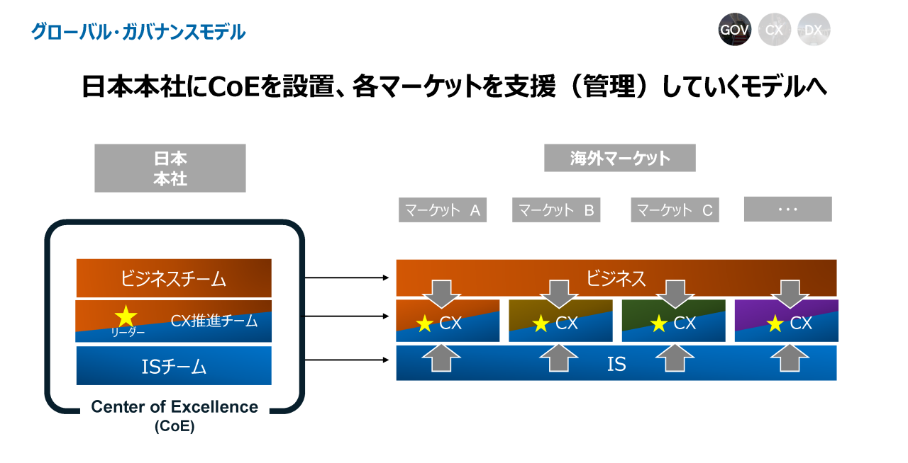 ガバナンスについては、まずCoE(Center of Excellence)をどこに置くべきかという問題があります[注1]。我々の経験では、グローバルでのCX/DX立ち上げ期や推進期においては日本本社にCoEを持ち、権限も集中すべきです。CoEを設置する際に注意すべき点を3つ挙げます。