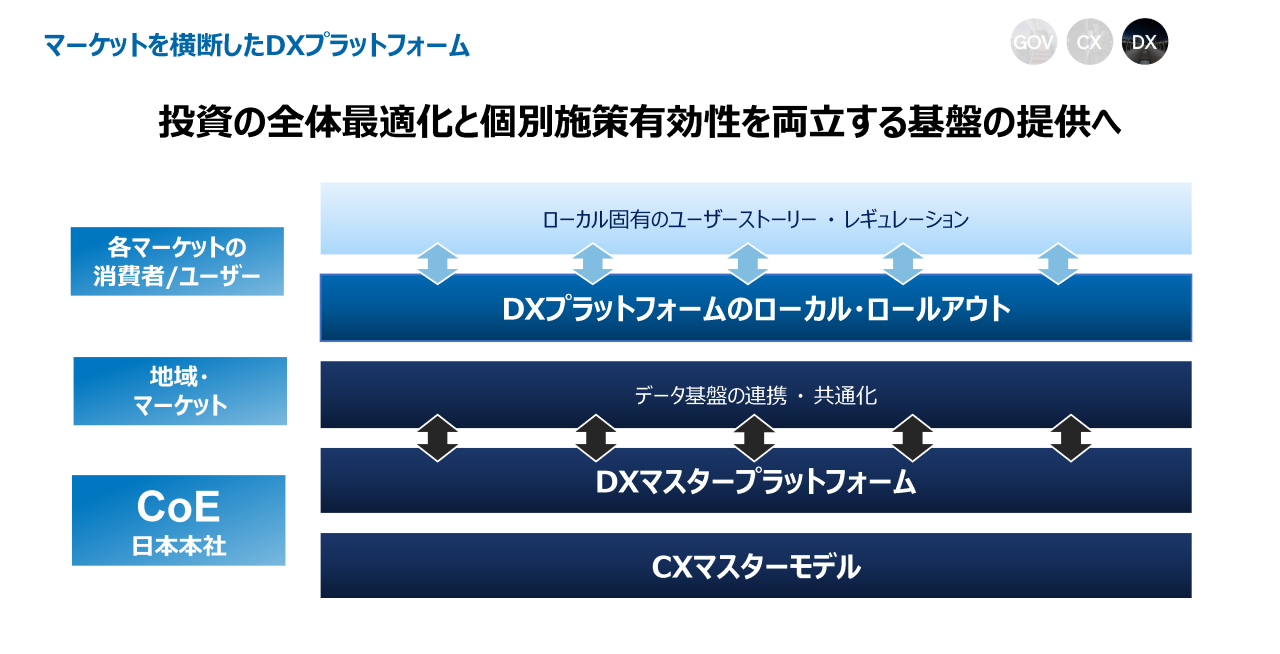 プラットフォームの構築は戦略ありきです。まずはグローバルな「CXマスターモデル」を作り、その後にローカライズします。ローカルの要件をしっかり聞いて、ローカルロールアウトを進めます。