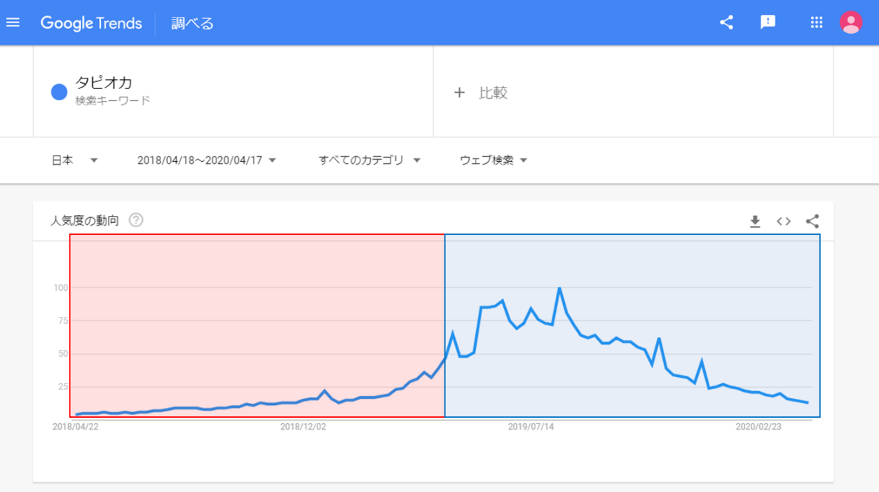 年周期での検索需要の変動傾向を見ると、季節性の影響や、そのトピック自体の需要の変動が把握できます。