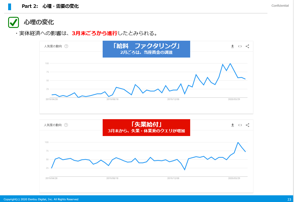 次に、需要の変化ですが、在宅時間の増加に伴い、「在宅で利用でき、他人との接触が不要な商品・サービス」の需要が増加する一方で、「外出・接触が必要な商品・サービス」の需要が減少しています。コロナの影響(需要の増減や、特徴的な検索傾向など)は、業界・テーマごとに異なるので、1つずつ丁寧に見てみる必要があります。