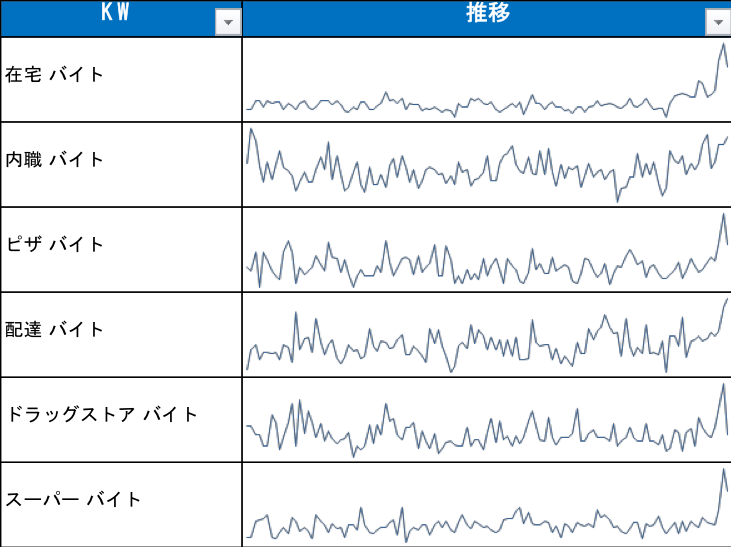 検索需要調査を、業界やテーマに関わる主要キーワード全般に対して行うことで、業界別の需要動向をうかがい知ることができます。以下は、アルバイト関係でコロナによる需要が伸びたキーワードの一例です。「家でできるバイト」「デリバリー需要の増加で求人が増える、宅配系のバイト」「人手不足が報道されることが多い、小売店でのバイト」などの検索需要が増加しています。