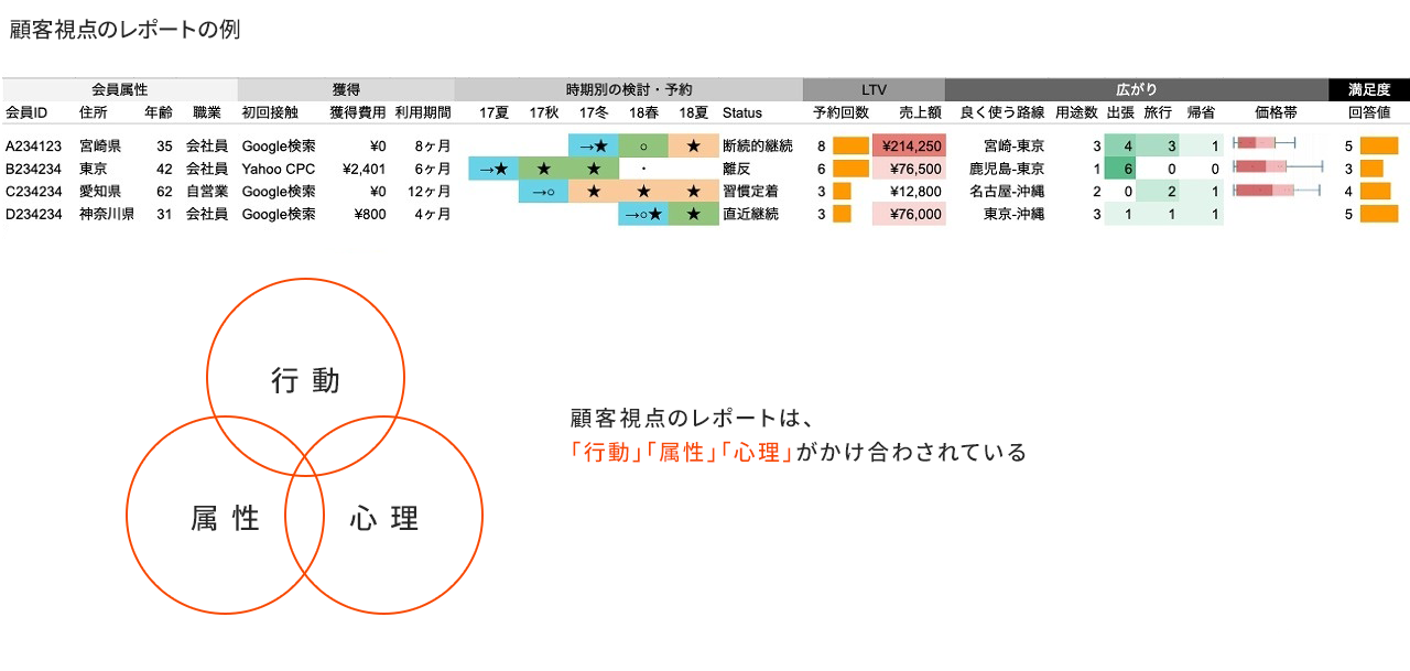 よくあるWebサイトのレポートは、PVや直帰率は、「過去の実績を表す指標は“企業視点”であり、事実ベースの行動データのみが可視化されたものだです。これに対し、これからの“顧客視点”のレポートはWebサイトの「入口」と「出口」だけでなく、「このページを閲覧した人はその後、どのように行動したかまで捉え、気持ちの変化を見る」必要があるのです。