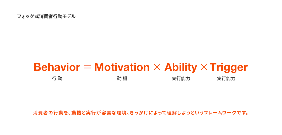 これは、人の「行動(Behavior)」を、「十分なモチベーション(Motivation)」「行動するための能力(Ability)」「行動を起こすトリガー(Trigger)」の3つの要素に分解し、行動を起こすための公式を「B=MAT」で表すモデルです。