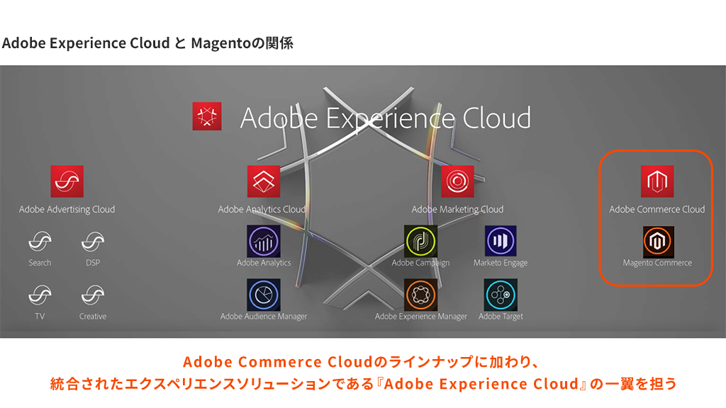 そこで重要になるポイントとして、鈴木は「CXデザイン」「プラットフォーム」の2点を挙げ、特に、プラットフォームについて紹介するのが、昨年よりAdobe Experience Cloudに加わったECプラットフォーム「Magento Commerce(以下Magento)」です。