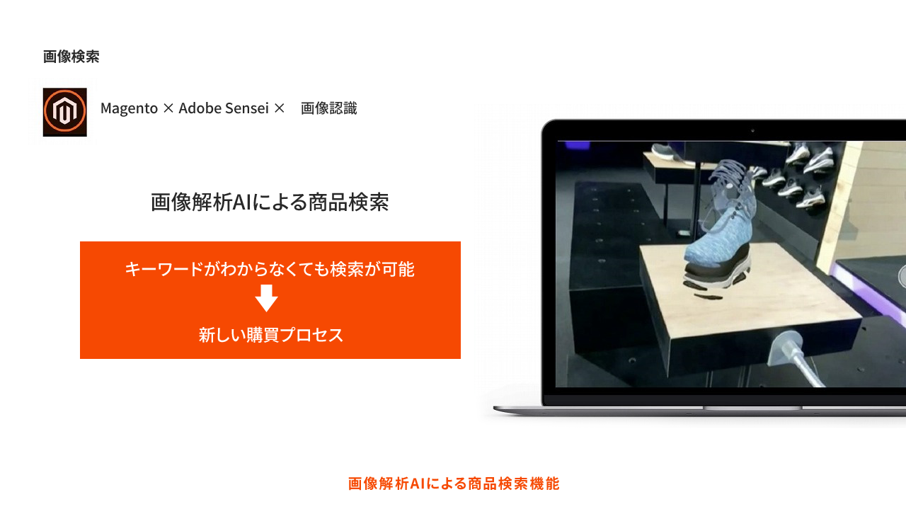 さらに、AIによる画像認識技術を用いて、検索キーワードがわからなくても写真から商品検索が可能になる機能などもあり、Adobe Senseiの技術とMagentoと連携させることで、より高度なパーソナライゼーションや、新しい購買プロセスの提供が可能になるのです。