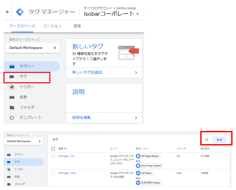 ① Googleタグマネージャーにアクセス。「タグ」⇒「新規」をクリック。