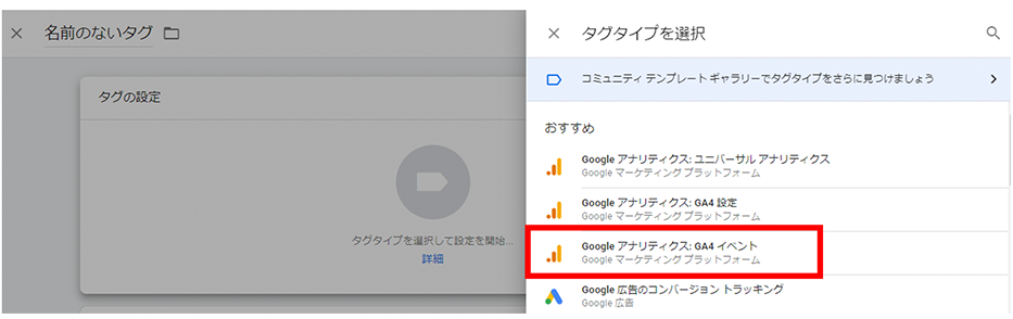 ② タグの設定をクリックして、「Google アナリティクス GA4 イベント」を選択。