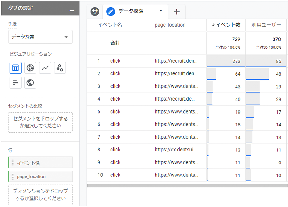 ※上記はイベント名「click」の行われたページを集計するためのパラメータ「page_location」を分析ハブで可視化した例となります。