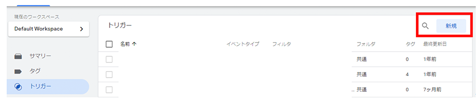 ④ 次にトリガーを選択して、右端にある「新規」ボタンをクリック