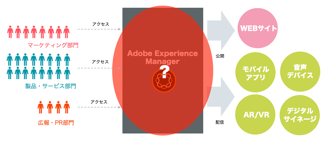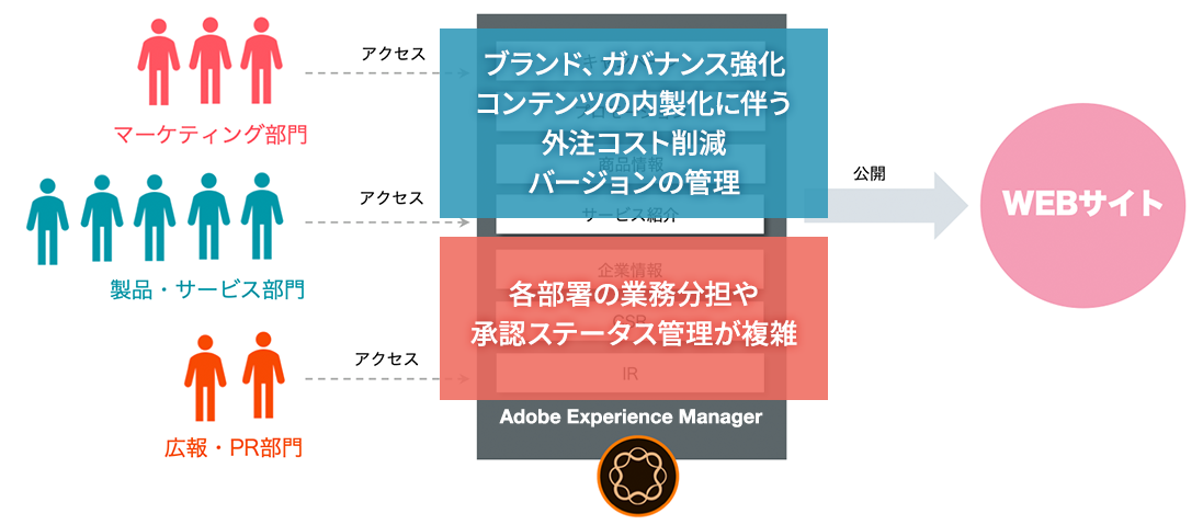 しかし一方で、従来のコンテンツ管理システム(CMS)という考え方から、AEMにさまざまなマーケティング機能が増え、ひとつのシステム上で多くの部門部署が関わるようになり、Webサイトだけでないさまざまなタッチポイントのコンテンツを管理するようになってきたことで、どのような業務フローを組み立てるか、どのように業務分担していくか、という部分は整理をしていかなければなりません。